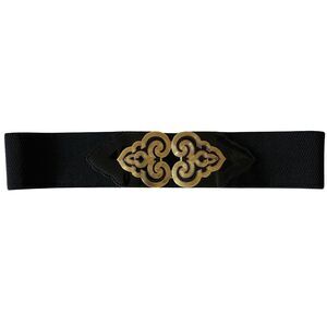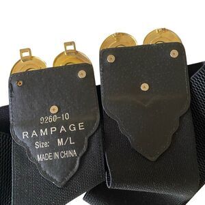 Wide stretch black stretch belt with fancy golden toned scrolled clasp closure. Each closure has a faux patent leather design underneath it. Nice stretch to fabric. Condition is exceptional for vintage age. Size M/L. Approximate measurements lying flat: 33.5” total length end to end but stretches up to at least 40” & 2.5” W Please message me prior to purchasing a bundle. #vintage #90s #stretchbelt #rampage #glam