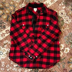 Stylish plaid blouse. Features red and black check pattern. Button-up front. Long sleeves. Perfect for casual wear.