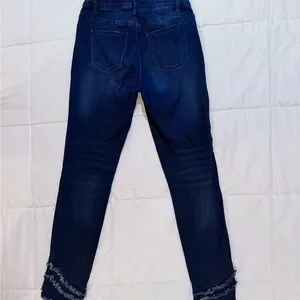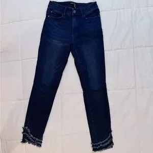 Stylish cropped jeans with a frayed hem. Deep midnight blue color. Perfect for everyday style.