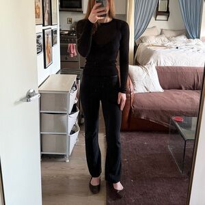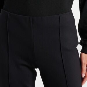 Slim leg pull on stretch pant in sleek viscose/acetate with front pintucks and slight flare at hem. Stretchy with an elastic waistband and hidden side zipper.