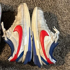 Classic Nike sneakers with a bold red swoosh. White exterior with blue interior lining.