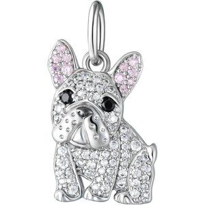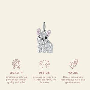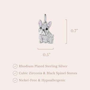 Polished Rhodium and Sparkly Gems: The Frenchie puppy dog charm is studded with sparkly cubic zirconia and real black spinel gemstones set in shiny Rhodium & Gunmetal