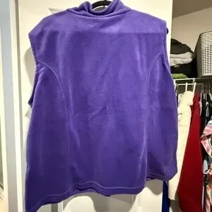 Warm fleece jacket by Columbia. Beautiful purple color. Features a zip-up front and sleeveless style. Gently used smoke free home.