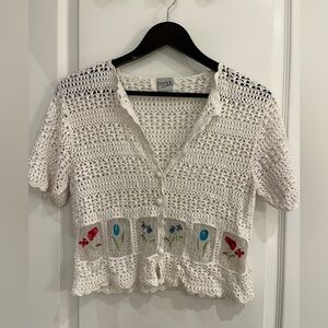 White Crochet Button-Up Top with Floral Embroidery Teddi