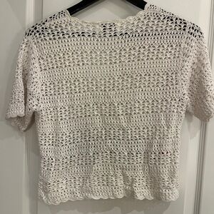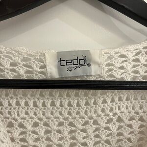 This elegant white crochet top features beautiful floral embroidery, perfect for adding a touch of charm to any outfit. The button-up design offers versatility and style. 16 ptp