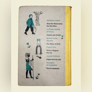 Vintage children's book with a yellow spine. Features 12 Classic Books, published in the USA in 1957 with 160 pages. Stories included are Abraham Lincoln, How the Rhinoceros Got His Skin, A Child’s Garden of Verses, Hansel & Gretel, Mother Goose Rhymes, The Story of Gold, Puppet Play, What a Magnet Can Do, Animal Children, Angus & the Cat, Pancakes & Breakfast, and This is Australia.