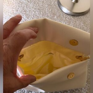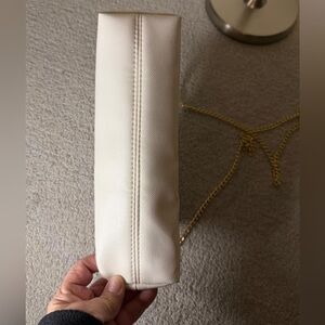 Elegant white bag with a sleek design. Features a gold chain strap. Perfect for any occasion.