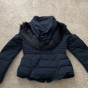 Gently worn coat, very warm. Hood can be zipped on/off. Color is navy blue with gold hardware.