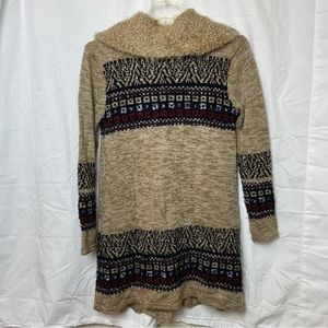 Umgee New Long Cardigan Sweater Tan W/Tribal Block design Cool Collar Sz.Small