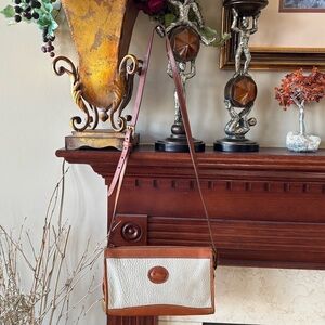 Vintage Dooney & Bourke All-Weather Leather Zippered Crossbody Purse Neutral Two-Tone. Adjustable length crossbody strap.