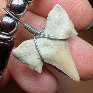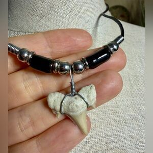 Material: Real or replica shark tooth, black cord, silver-tone metal and black accent beads.