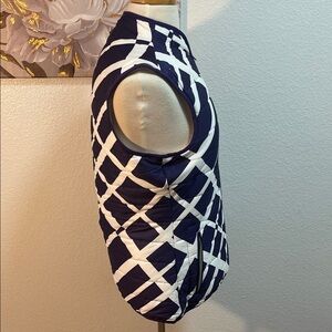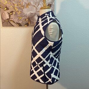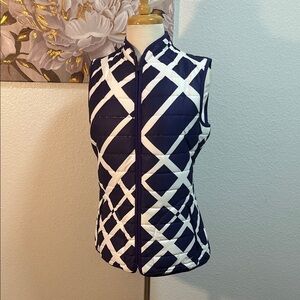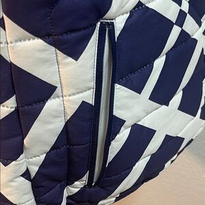 Stylish purple and white puffer vest with a geometric pattern. Perfect for layering. Great condition but one pocket the zipper came off. Still have it if someone has a truck to get it back on