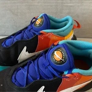 Colorway: The shoes feature a black mesh upper, a white animation-inspired Nike Swoosh, an orange/red/yellow heel overlay with multicolor concentric circles, blue interior lining and laces, and a bright blue rubber outsole.