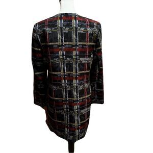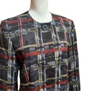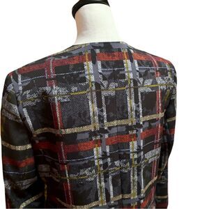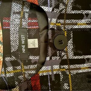 Add a touch of sophistication to your wardrobe with this Nine West Women’s Crepe Printed Topper Jacket in size 8, excellent used condition (EUC). This stunning jacket features a vibrant printed design in a Bordeaux colorway, complemented by striking metal buttons for a polished finish. The structured silhouette is versatile enough for work or casual outings, making it a standout addition to any collection.