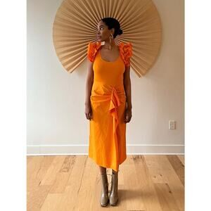 The Isabella Dress is cut in a combination of fine ribbed knit and crisp cotton poplin, which contribute to this exciting silhouette with their own characteristics. This dress features dramatic shoulder ruffles that frame the scoop neck, as well as a slightly fitted skirt and cascading ruffle down the center front which produce a comfortable yet flattering fit. A juicy, eye-catching Marigold hue finishes this statement making dress. Side seam zip closure for easy wearing. Style this with the Salinas Flatform Espadrilles in Noir for a full Ulla look!