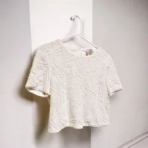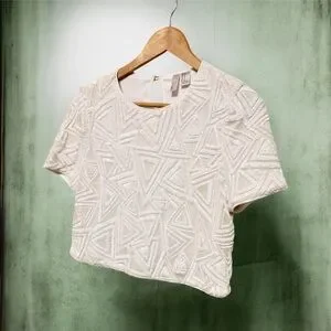 Stylish ivory crop top with geometric patterns. Ideal for trendy looks.