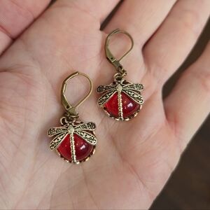 These new, hand-crafted vintage style dragonfly earrings feature an etched dragonfly curved over a red half orb.