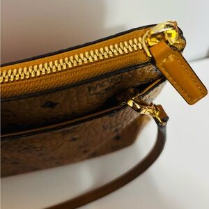 This is an MCM Visetos Medium Crossbody Pouch in Cognac. This chic crossbody bag is crafted of visetos coated canvas in brown with MCM monogram printed in black throughout. The bag features an optional, adjustable leather shoulder strap, a front pocket, and polished gold hardware. The top zipper opens to a light brown fabric interior with zipper and patch pockets.