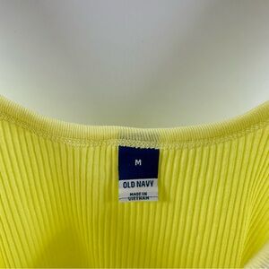 Old Navy ribbed tank top in a bold neon yellow shade, featuring a classic scoop neckline. Made from a soft, stretchy material that offers a flattering, fitted look. Great for layering or wearing on its own during warmer days to add a fun pop of color to your outfit.