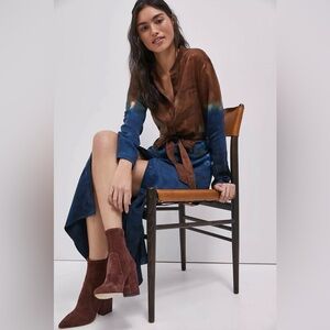Anthropologie Cloth & Stone Perla Tie-Dye Maxi Shirtdress. It is a long-sleeved, button-down maxi dress that features a rust-brown color on the top which fades into a deep indigo blue tie-dye effect towards the bottom. NWOT. Size Small.