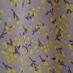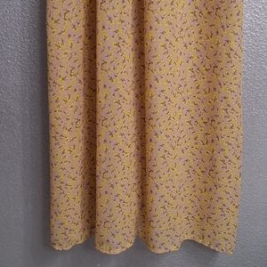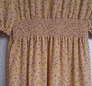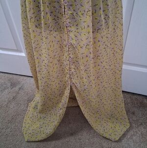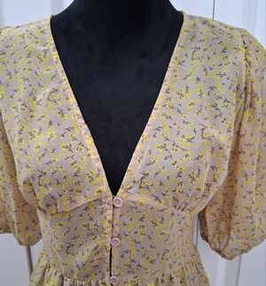 Charming floral dress in a delightful yellow hue. Perfect for any occasion. Has a v neck balloon sleeves & a 21" opening at the hemline. Very light & airy