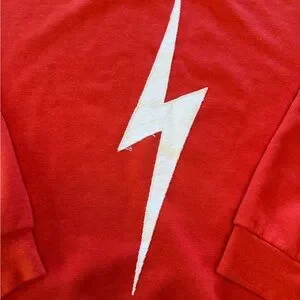 Bold red crewneck with striking white lightning bolt. Soft and stylish. Ideal for casual wear.