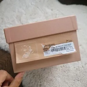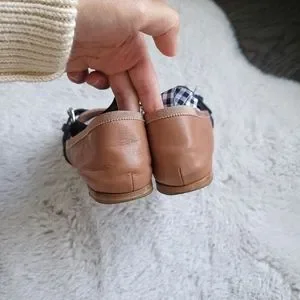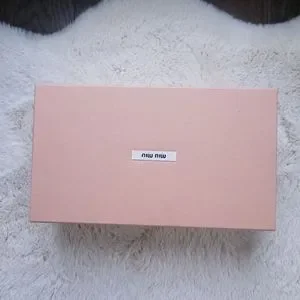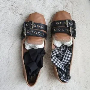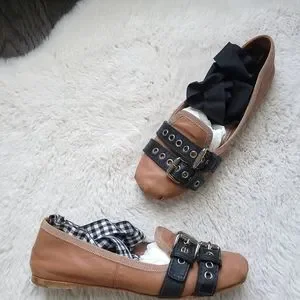 Miu Miu Balletcore Tie Up Belted Leather Ballerina Flats, in a blush color with black and checkered ties. Comes with box, dust bags, extra laces.