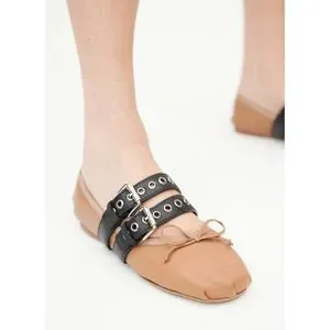 Contemporary details combine to ensure that these Miu Miu ballerina shoes have a bold and unexpected aesthetic. Mismatching ankle straps contrast with buckle detailing to create a pair that is eye-catching in its contradictions.