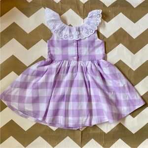 Light purple lavender and white gingham dress. Flared circle skirt and scoop neck with a white scalloped eyelet collar. buttons down the back and a full lining. New without tags. Perfect for spring and vacation with a hair bow from my closet.