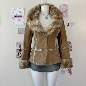 Such a good Penny Lane moment. Tan faux suede Afghan-style jacket from QED London's Purple Rain line with shaggy cream faux fur trim along the collar, cuffs, and hem. Fitted, flattering shape with visible seam detailing that gives a true 70s rockstar / boho vibe.