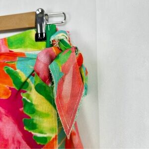 Bold mini skirt with colorful leaf design. Features a stylish waist tie. Ideal for a lively summer outfit.