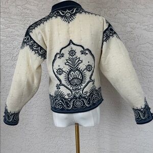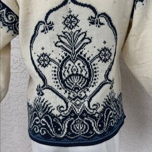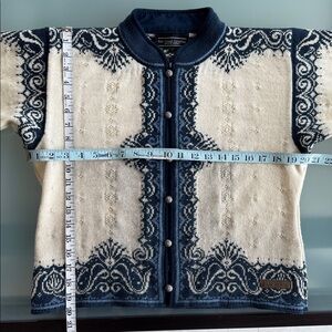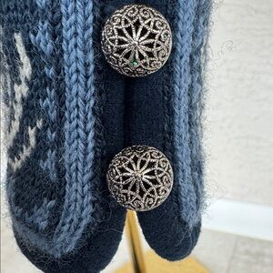 Intricate Scandinavian knit design features cream colored knitted main body with a delicate / lacy stitch. Accent flowers and shoulder trim in navy and medium blue. Six Norwegian pewter buttons attach with button loops and also there are two decorative buttons on the sleeves which are attached with button loops. Spare button included.