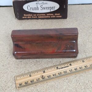 A vintage Hostess Crumb Sweeper with its original box. designed to efficiently sweep up crumbs ashes dust and dirt from tablecloths with ease. Its classic design makes it a functional and decorative addition to any kitchen or dining room. Perfect for quick cleanups after meals or for use during special occasions.