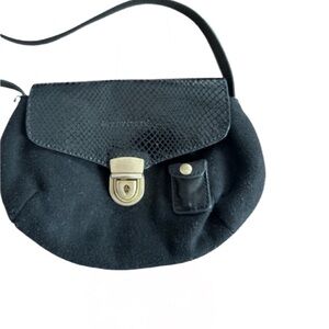 This amazing mini crossbody has wool and snakeskin leather. Excellent combination. She is tiny but packed with power! The tiny pocket with a key is just an added bonus! Stunning! Approx 8 inches across. Key is 1 inch.