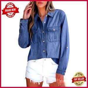 Denim Button Down Shirt Classic Chic Oversized Fit Long Sleeve Casual Top