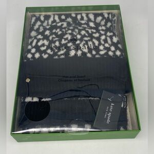 Elegant hat and scarf set by Kate Spade. Features a classic black and white design. Ideal for a sophisticated winter look.