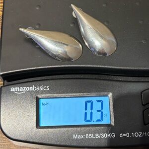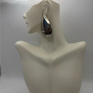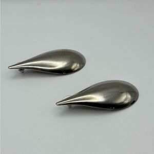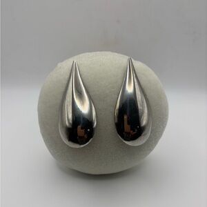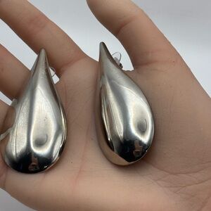 These are stunning, sculptural statement earrings. Featuring a high-polish silver tone finish and a dramatic oversized teardrop silhouette, these earrings blend 80s vintage inspiration with a clean, contemporary aesthetic. They are incredibly eye-catching, catching the light beautifully from every angle.
