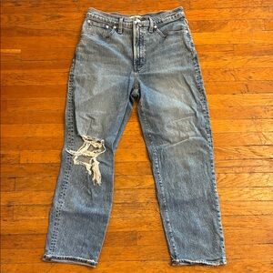Madewell perfect vintage straight jean with a stylish distressed detail. I love these jeans so much but they no longer fit. They are so comfortable even with minimal to no stretch. They have only been worn a few times, so they are in excellent condition