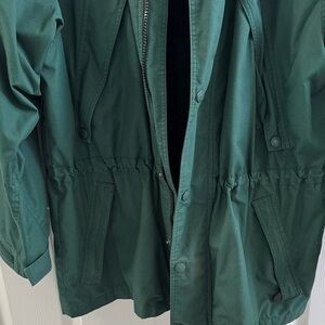 Classic field jacket with high collar. Features snap closures and adjustable waist. Perfect for outdoor activities.