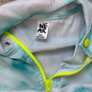 Stylish blue and white tie-dye pullover with neon yellow accents. Features a 1/4-zip design and front pockets. Polyester spandex blend