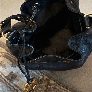 Sophisticated black leather shoulder bag. Features gold-tone accents. Perfect for everyday use.