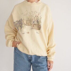 This Vintage Northern Reflections sweatshirt features a soft butter yellow base illustrated with a peaceful prairie scene of wildflowers, tall grasses, and a woven garden basket nestled among blooming plants. The artwork has a delicate, storybook quality that gives the piece a dreamy Cottagecore mood, perfect for slow mornings, antique markets, and quiet days surrounded by nature. The floral meadow imagery adds charm and visual interest while the butter yellow background keeps the look light, gentle, and wearable.
