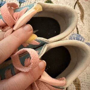 Flower canvas sides, blue leather toe and pink sole