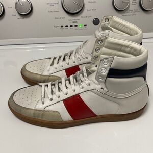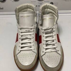 Saint Laurent sneakers in white leather with red accents. Features a classic high-top design and durable sole distressed look as is no box 💯 Authentic mens size 9 (42)