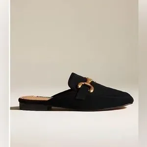 Bibi Lou black mule loafers with gold bit detail. Size EU 37. New, never worn. Slip-on backless loafer style with smooth black upper and gold hardware accent. Low heel for comfort. Classic and versatile, great for work, business casual, jeans, trousers, or dresses.