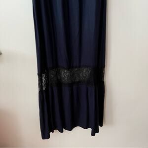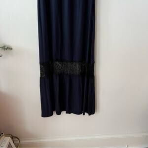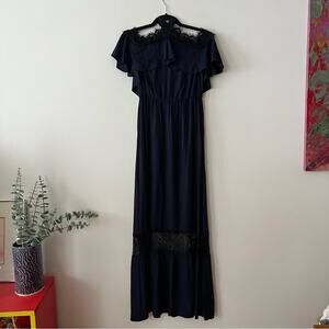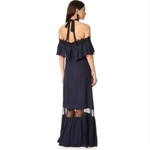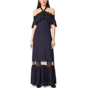 This Alice + Olivia Mitsy Off-the-Shoulder Maxi Dress combines the cold-shoulder trend with the sexy halter neck as well as tiers and contrast lace trims. In good preowned condition. Navy blue with black accents. Viscose.
