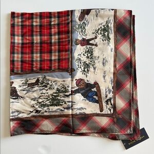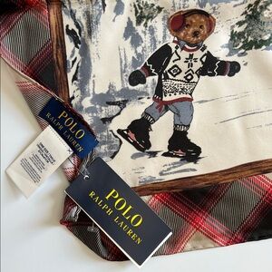 Add a touch of classic Americana to your winter wardrobe with this stunning Polo Ralph Lauren Bear scarf. Featuring a charming illustrated scene of the famous Polo Bear skiing, ice skating, and sledding, this piece is surrounded by a timeless red and black plaid border.
