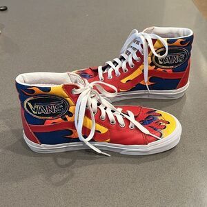 Vans Sk8-Hi Racer Leather and Canvas Sneaker in Awesome Red / True Blue ~ Stylish high-top sneaker that features a combination of sturdy leather and canvas uppers with prints and cool looking flames, VANS symbol embroidery and the all famous signature rubber waffle outsoles