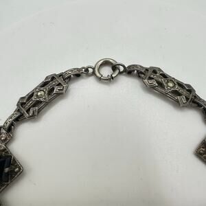 Antique Art Deco sterling silver genuine black onyx marcasite bracelet 7.25"