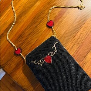 Elegant crossbody with detailed Queen of Hearts design. Features rich red and gold beading. Adds a regal touch to any look.